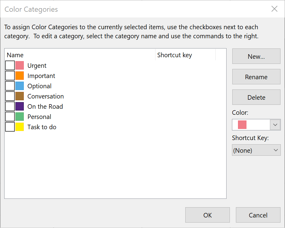 TIP #1: When adding an Appointment or a Meeting in your calendar always assign a specific Category, so all items in your calendar have a color code assigned. If you use Microsoft Outlook, the Category setting might look like the one below.